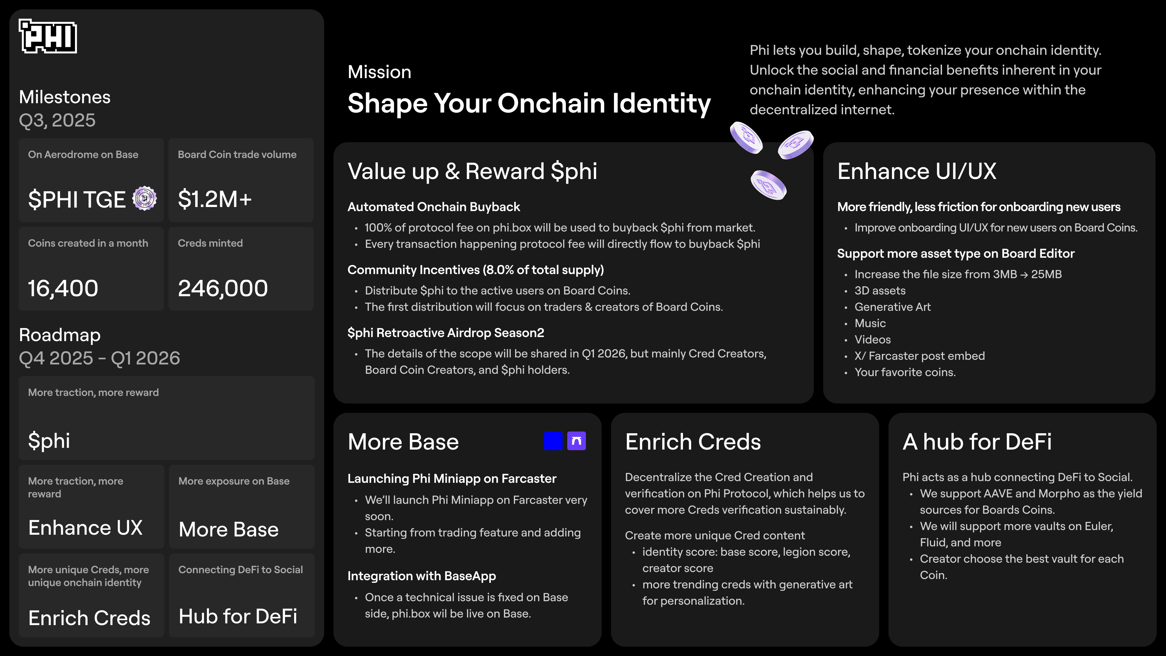 Alongside Board Coins, we also launched $PHI, the native token for the Phi ecosystem. Here's a quick snapshot on $PHI: